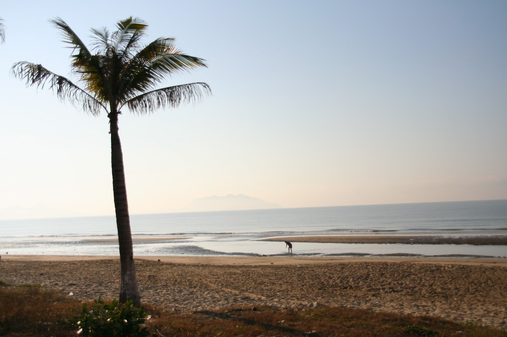 沿着海滩接着走,到了一片非常漂亮的沙滩。不过适合游泳的就刚才“海滨浴场”那一块了,这个沙滩虽然很漂亮,但是沙质非常松软,在海边脚一踩就陷下去了。而且沙滩不全是由沙组成,其中还有大量的贝壳、螺丝、珊瑚残骸。如果你想赤脚走上面的话,可是要经受住考验的。我们在这还捉到一个非常大的寄居蟹,是我见过的寄居蟹中最大的了,呵呵。另外我们公司的人还捉到了海胆!真是强,海胆被惊吓以后等于就是一个刺球。这样他们都可以捉到,佩服!佩服!踩在大海里的感觉真是舒服,感受着海浪一个一个的向你打来,一低头就可以很清楚的看到自己的脚趾。