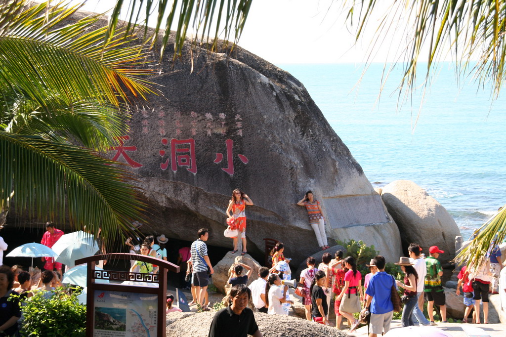 从“寿比南山”走下来,就到了“转运石”和“小洞天”了。转运石就是在阶梯中间突然多了那么一颗石头,就叫做转运石。:D 小洞天呢,说出来就更有意思了,哈哈!小洞天是海边的一颗巨石,因为这颗石头比较巨大,所以石头下面就有一条很宽的缝。人们可以从这条缝里面钻进去,然后从另外一边出来,另外一边的出口呢只有一小个口,抬头就是天。所以这个就是海南非常非常著名的景点--小洞天!我估计大洞天的话可能是有块石头比这块石头更大一点,所以叫大洞天吧。哈哈~