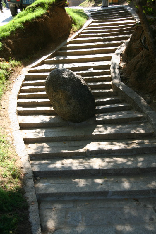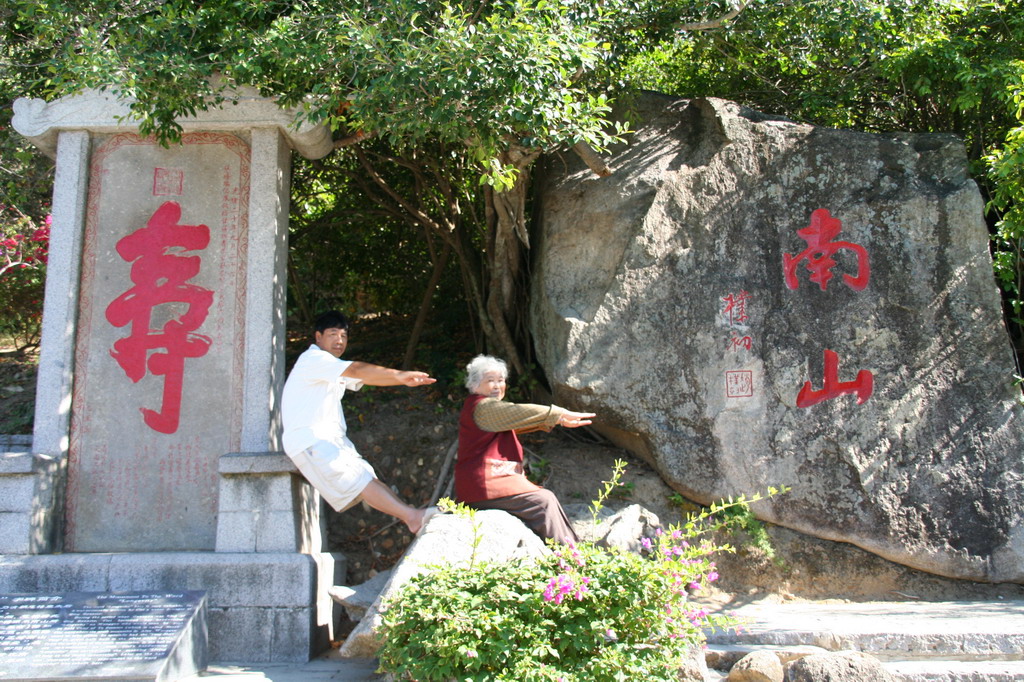 进去后发现,这里已经开发的相当完善了。因为景区距离大门有一小段距离,所以在一进大门就有卖电瓶车票的。如果你不想走这段路的话可以坐电瓶车。因为我们的游览时间大概就只有二个小时,所以里面的讲解员也是带着我们飞奔:“金峰软件的,金峰软件的,跟上,跟上,集中一下。”一路上就不停的听见解说员说这句话,其它的什么都不说,连附带的景点都不介绍,晕啊…… 一路走到南海龙王别院,才真正进入景区。这里的景色大部分都是人工的,感觉意思不大。跟着解说员逛了龙王别院、三千年的不老松(还没到六千年的),就到了“寿字碑”。这个景点也真是搞笑,左边一个“寿”字碑,右边一个“南山”碑。导游就让两个人坐中间,把手脚抬起来,做出一个“比”字来。说这就是“寿比南山”了。无言的景点……但是还是N多人都排着队来照这个“寿比南山”,呵呵。