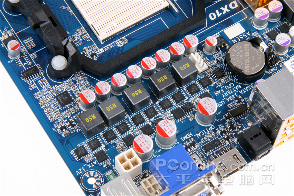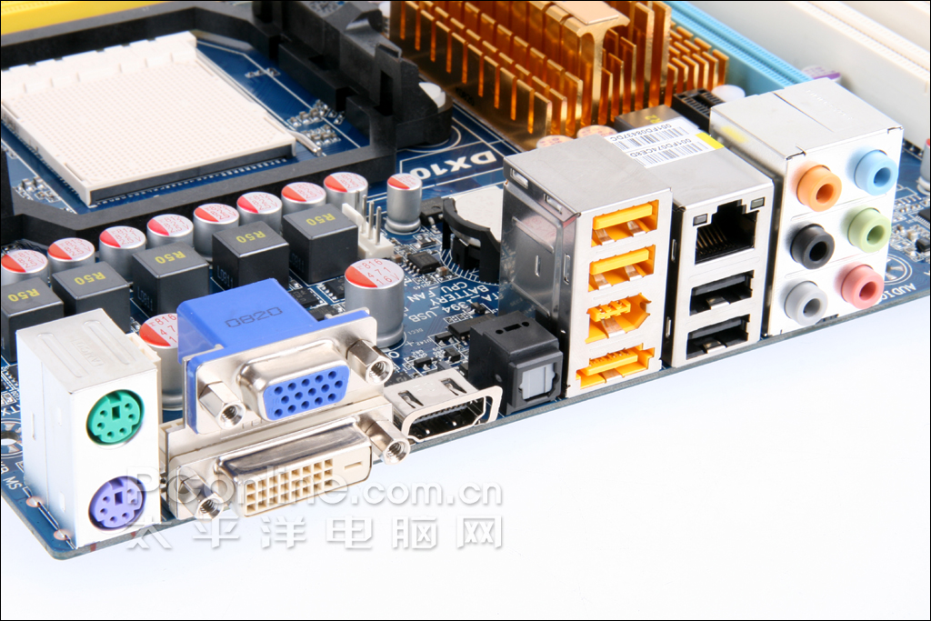 主板接口可谓相当丰富,具有HDMI + DVI + VGA完整的视频输出接口,音频方面不但有7.1声道声卡,还有光纤音频接口,并且还具备IEEE 1394、eSATA和千兆网卡。需要说明的是技嘉MA78GPM-DS2H获得HDMI协会所颁发的最新1.3*规格认证,可提供高达5Gb/s的影像资料传输频宽,更可同时提供多声道的音讯信号传输;经由非压缩式的数位资料传输,可有效降低数位/ 类比转换时所造成的信号干扰与衰减,并完整支持Full HD 1080P规格。相容于HDCP版权保护机制,可完整播放Blu-ray/ HD DVD与其他受内容保护的内容。