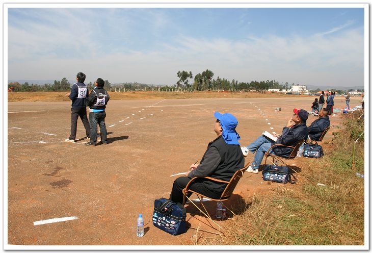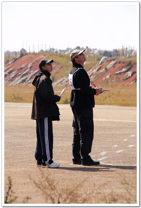 比赛现场:前面一个是飞手,后面一个是助手。看到后面三个坐着的了吧?这三个可是专业裁判!