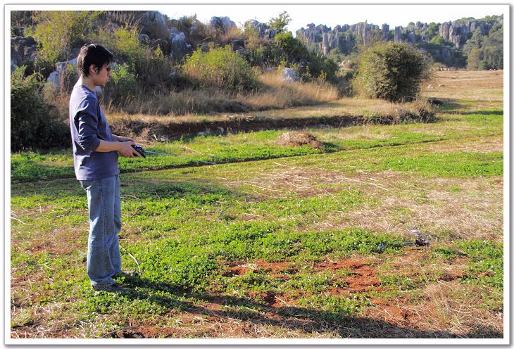 吃完饭,就开始我们表演了,呵呵。当然不能到石林机场去和大飞机比赛了。我听模友说在乃古石林那有一片非常好的飞场….